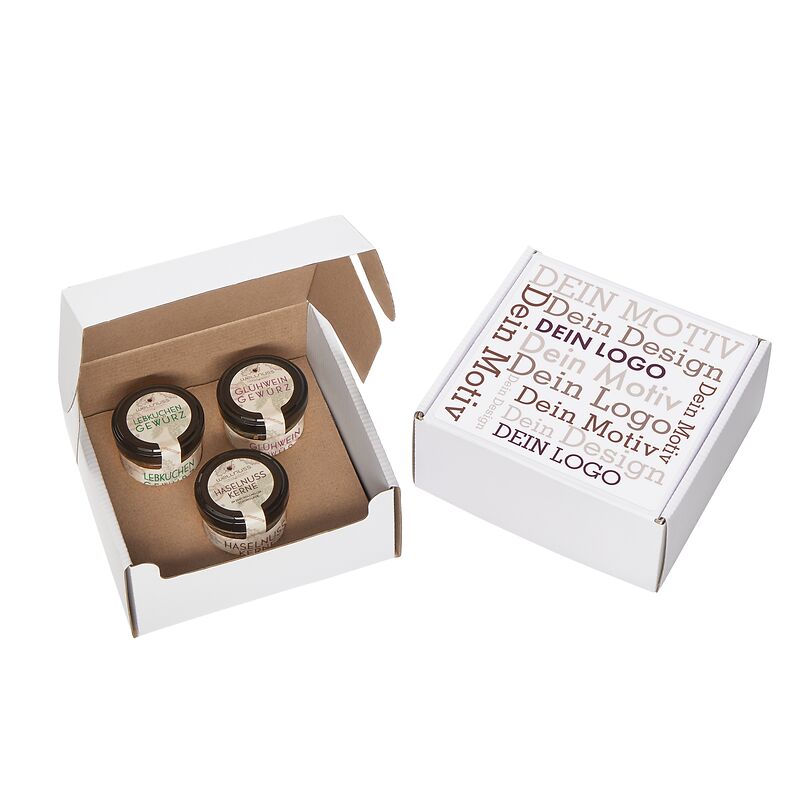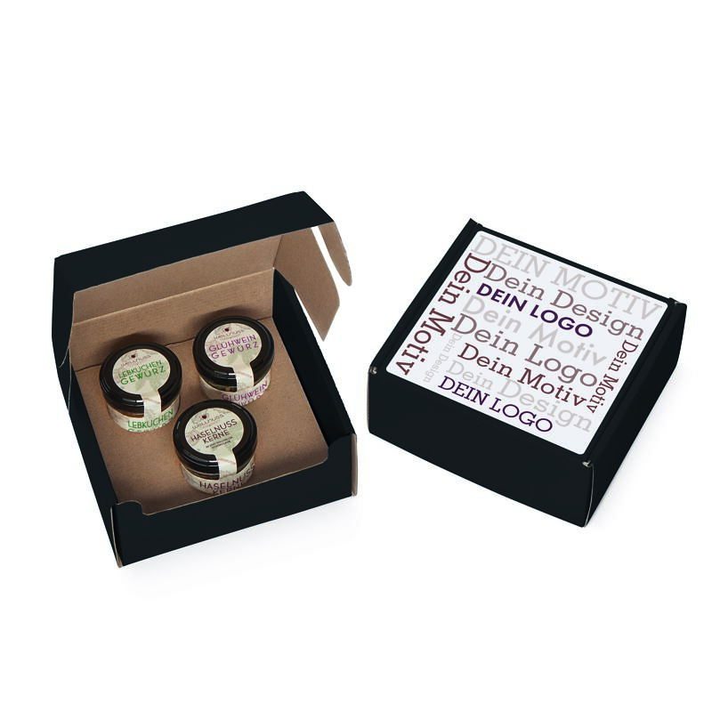 Ab 100 Stück mit Ihrem Etikett im 4c Druck auf dem Deckel des Geschenkkartons, ab 1.000 Stück vollflächig bedruckt im Offsetdruck: Verschenken Sie Weihnachts-Spezialitäten mit Premium Zutaten ohne künstliche Zusatzstoffe, 100 % plastikfrei verpackt und mit Liebe konfektioniert in Deutschland. Sie suchen eine andere Größe? Dieses Premium Präsent ist auch mit 2 oder 4 Gläsern erhältlich.