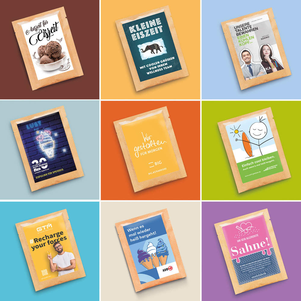 Ab 500 Stück mit Ihrem Motiv im 4c Druck auf dem Etikett des Portionsbeutels, ab 5.000 Stück vollflächig bedruckt im Digitaldruck: Das perfekte Sommer Give-away schmilzt im Mund, nicht beim Versand. Funktioniert auch ohne Eismaschine. Das Eispulver braucht nur noch einen Schuss Sahne und Milch, ein paar Stunden im Gefrierfach und fertig ist die eisige Leckerei. Und der Veredelungskreativität mit Schoko- oder Nussstückchen sind ohnehin keine Grenzen gesetzt. Mit reinem Himbeerpulver ohne Zusatz von Aromen und Geschmacksverstärkern. Dieser Artikel ist glutenfrei und kann auch mit Milchersatzprodukten zubereitet werden.
