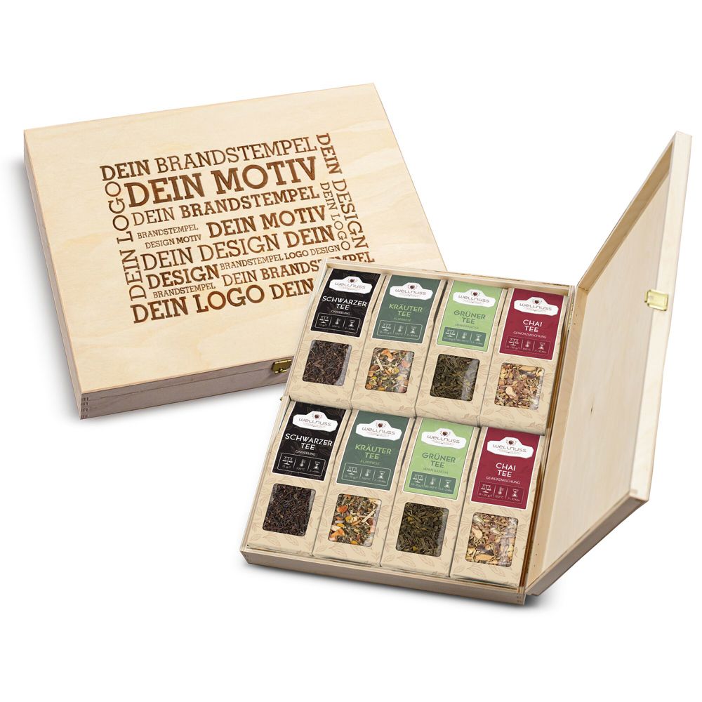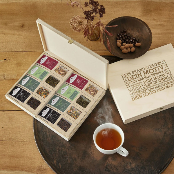 Ab 50 Stück mit Ihrem Branddruck auf dem Deckel der Birkenholzbox: Ein Geschenk liebevoll und nachhaltig zu verpacken, bereitet Freude. Deshalb lassen wir unsere Premium Präsentboxen in einem Familienbetrieb von Hand fertigen und Ihr Logo in den Deckel einbrennen. So entsteht ein Premium Präsent mit Langzeit-Werbeeffekt. Wählen Sie aus folgenden Tee Spezialitäten: Schwarzer Tee Darjeeling, Grüner Tee Japan Bancha, Kräutertee Almwiese oder Chai Gewürzmischung Sie suchen eine andere Größe? Dieses Premium Präsent ist auch mit 2, 3 oder 4 Snacks erhältlich.