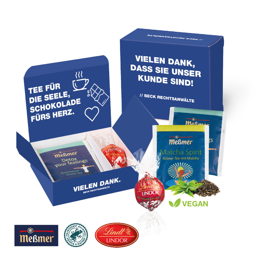 Ein Moment zum Durchatmen. Zwei aromatische Tees von Meßmer und eine zartschmelzende Lindor Praline von Lindt vereinen sich zu einem Moment purer Entspannung. Die hochwertige Box lässt sich individuell mit Ihrem Logo oder Design bedrucken und wird so zum perfekten Präsent für Kunden und Mitarbeiter. Ein genussvolles Dankeschön mit Stil. Produktdetails: Teebeutel von Meßmer und eine Lindt Lindor Praline, in einer individuellen Werbekartonage. Nachhaltigkeit: Für jede Bestellung mit uns wird ein Baum über GROW MY TREE gepflanzt. Wir verwenden FSC® zertifizierten Karton aus nachhaltiger Forstwirtschaft und anderen kontrollierten Quellen.