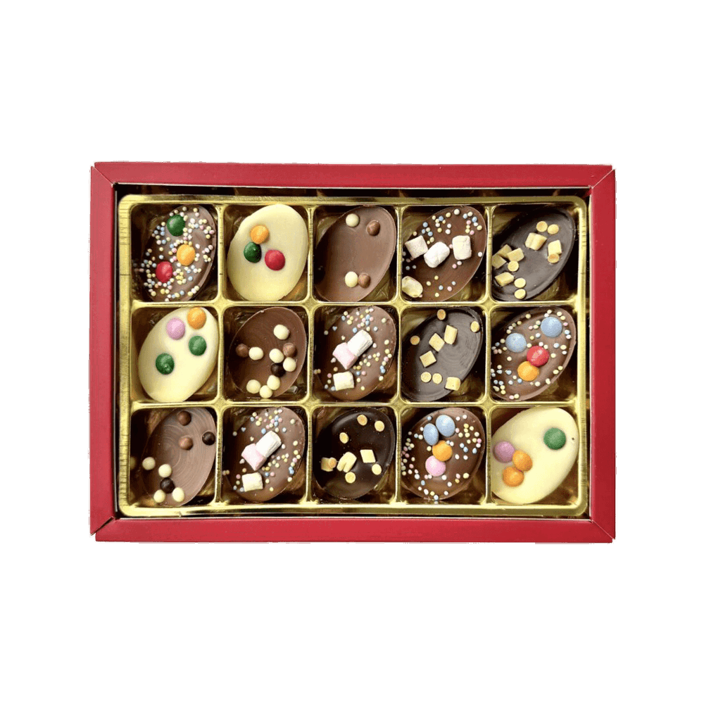 Halbe, massive Ostereier, versehen mit einem dekorativen Topping – hübsch und lecker zugleich. Was für ein Ostergeschenk. Ein Topping in frischen Frühlingsfarben: Mini-Smarties, Karamellstückchen oder Mini-Marshmallows. Die Eier sind aus Milch-, Weiß- und Zartbitterschokolade hergestellt.