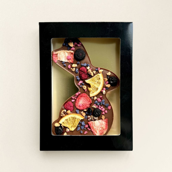 Ein Schokoladen-Osterhase, verziert mit einer Mischung aus verschiedenen Früchten und anderen Köstlichkeiten. Genuss mit einem großen G.