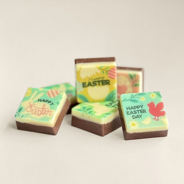 Bedruckte Pralinchen mit fröhlichen Osterdekorationen. Eine Schicht Vollmilch- und weiße Schokolade mit verschiedenen Osterdesigns.