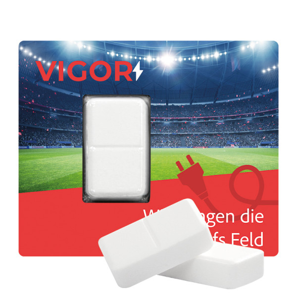 Traubenzucker in Karte aus weißem Karton mit Stanzung und transportsicherem Frischetresor, individuell bedruckt. Inhalt: 1 Traubenzucker mit Vitamin C (Apothekenqualität), Rechteck mit Bruchkerbe, 3 g
