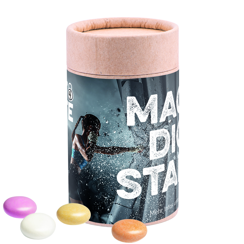 Papierdose Eco Midi, kompostierbar, rundum mit Papieretikett, individuell bedruckt. Mit Originalitätsverschluss. Inhalt: Mentos Kaudragee Fruit (Erdbeere, Orange, Zitrone - gemischt)., 130 g