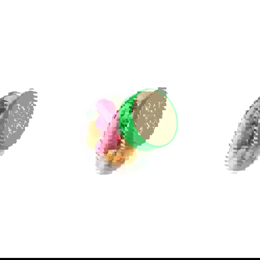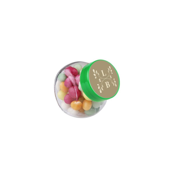 Mikro Glas 50 ml mit grünem Deckel gefüllt mit Farbige Zuckereier und einem 4c-Euroskala Aufkleber auf Deckel