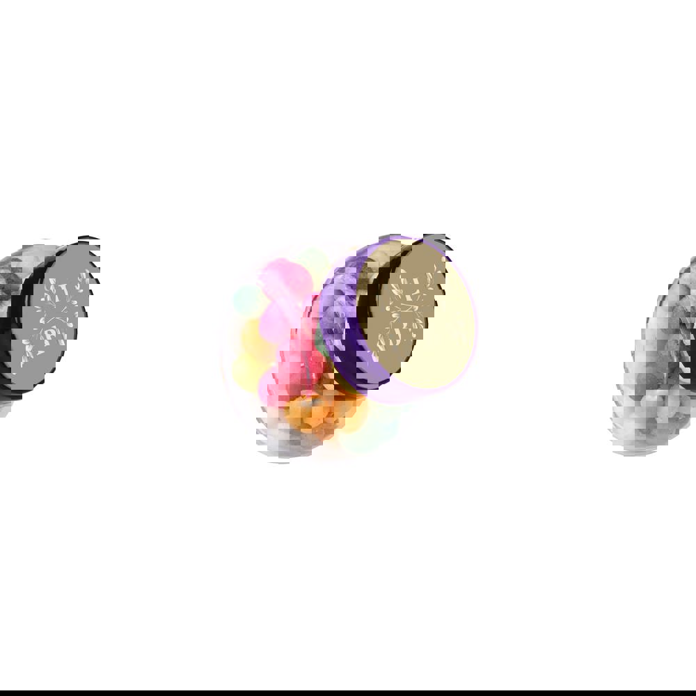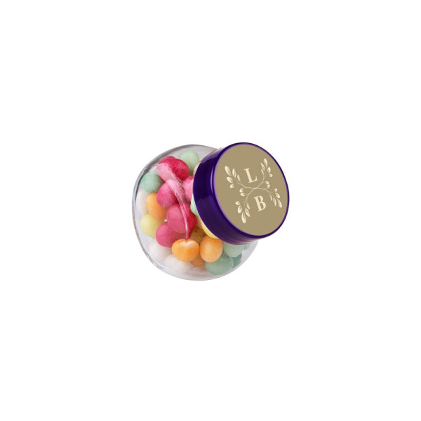 Mikro Glas 50 ml mit violettem Deckel gefüllt mit Farbige Zuckereier und einem 4c-Euroskala Aufkleber auf Deckel
