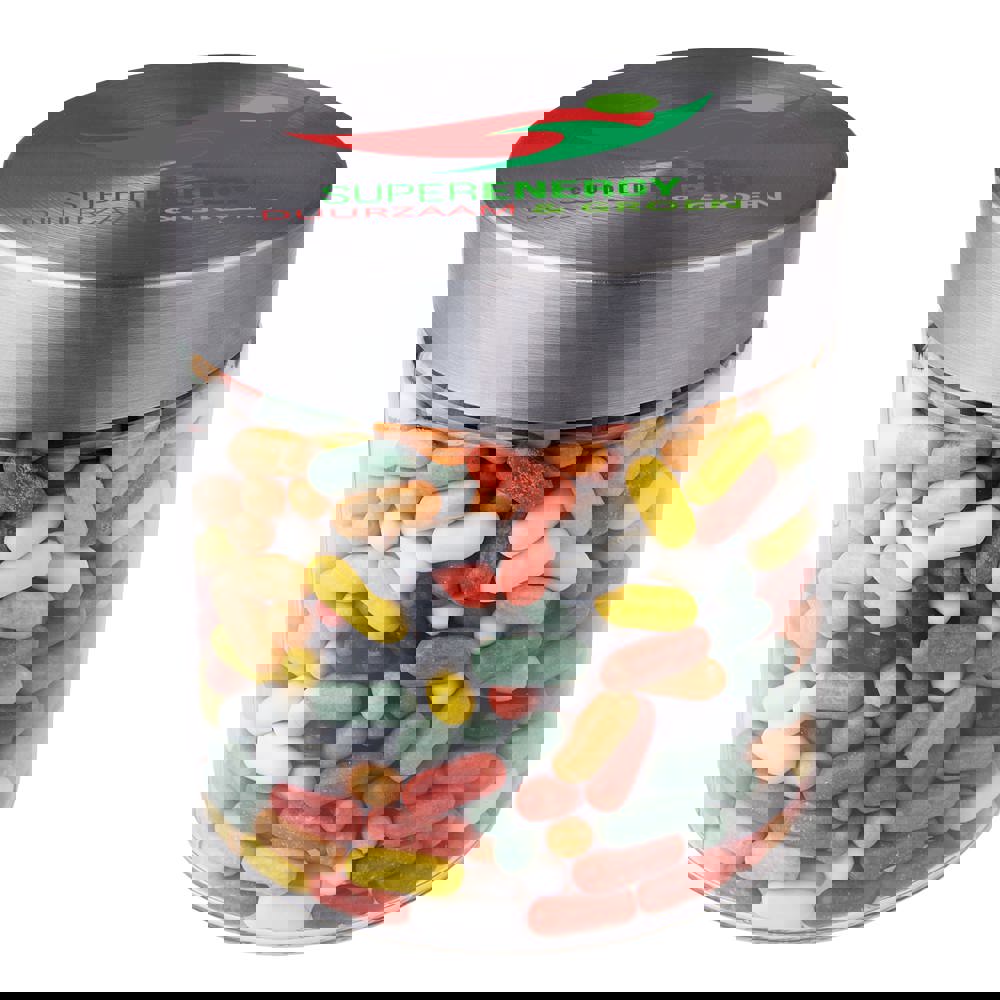 Glas mit rostfreiem Deckel 0,9 Liter mit 4c-Euroskala Druck auf dem Deckel und gefüllt mit Lakritzstangen mix