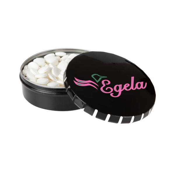 Klick-Klack Dose schwarz mit 50 Gramm zuckerfreiem Pfefferminz, 4c-Euroskala, inkl. Zutatenaufkleber und eingeschweißt