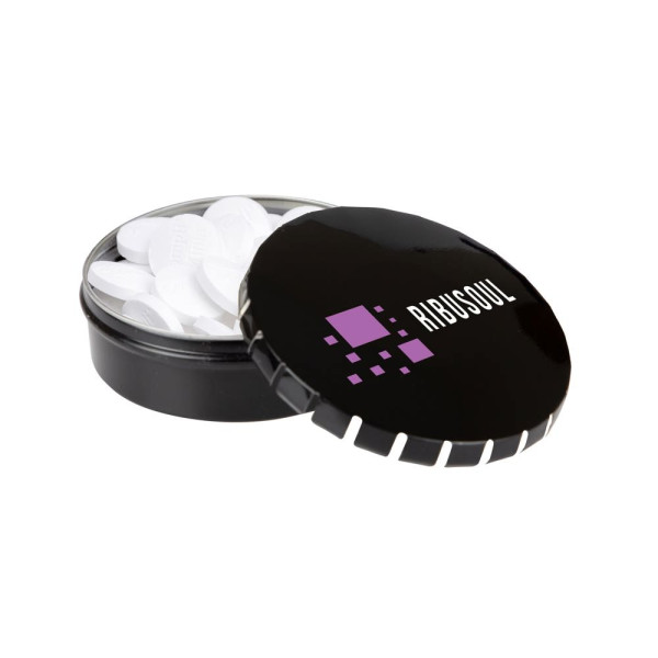 Clic-clac-Dose schwarz mit ca. 50 Gramm Compli'mints Pfefferminz und mit einem vollfarbigen Aufdruck versehen. Inklusive Inhaltsstoffaufkleber und Siegel.