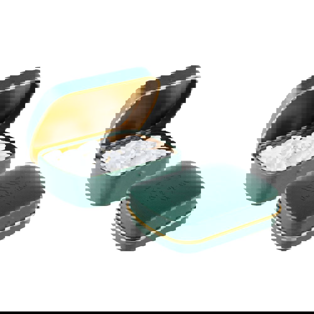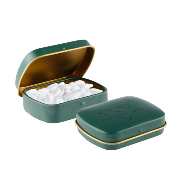 Mini Klappdeckeldose mattgrün mit goldener Innenseite und ca. 23 Gramm Pfefferminz. Und mit Prägung. Inklusive Inhaltsstoffaufkleber und Siegel.