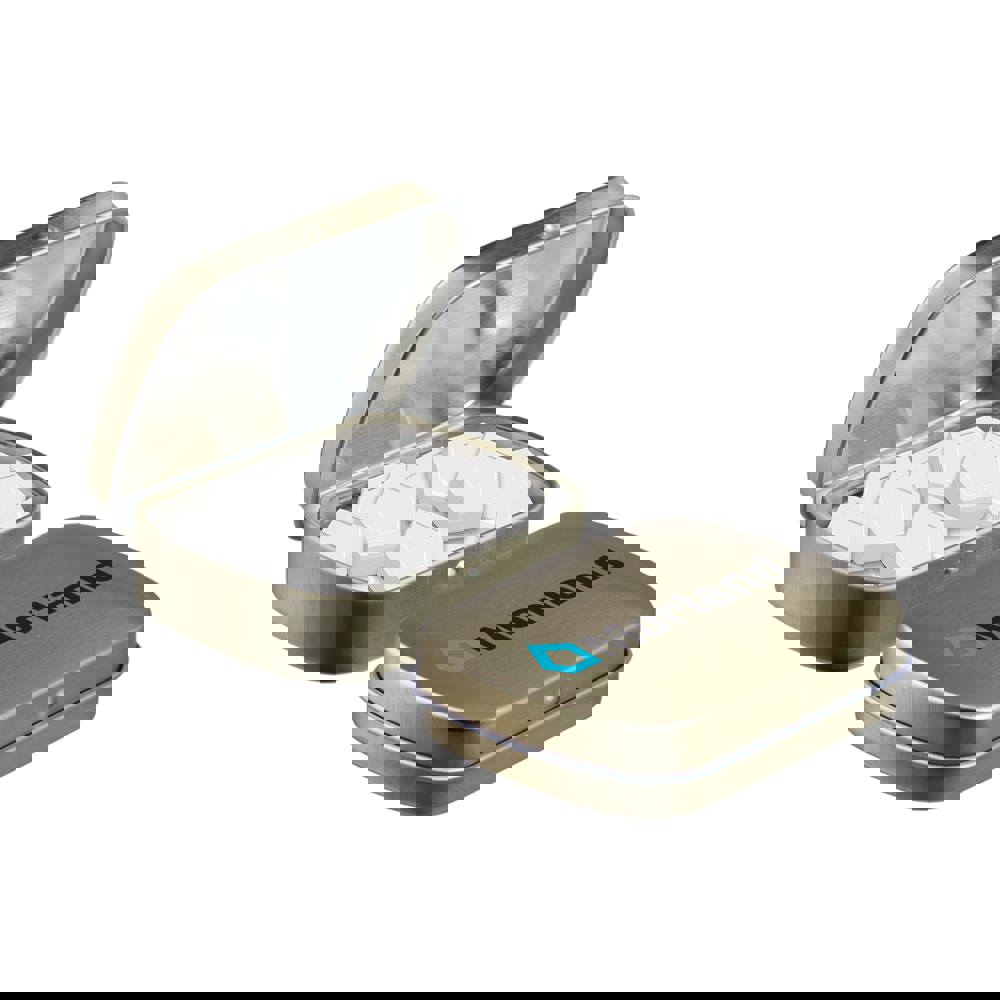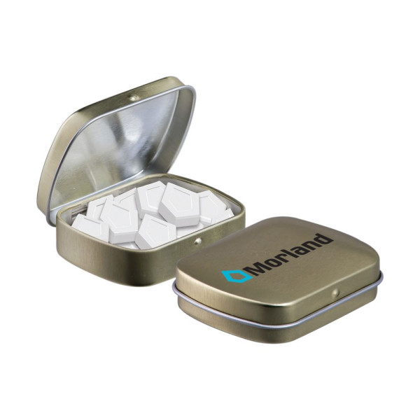 Mini Klappdeckeldose gold mit ca. 23 Gramm Logo Pfefferminz , 4c-Euroskala bedruckt, mit Zutatenaufkleber und eingeschweißt