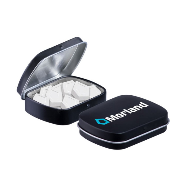 Mini Klappdeckeldose mattschwarz mit ca. 23 Gramm Logo Pfefferminz, 4c-Euroskala bedruckt, mit Zutatenaufkleber und eingeschweißt