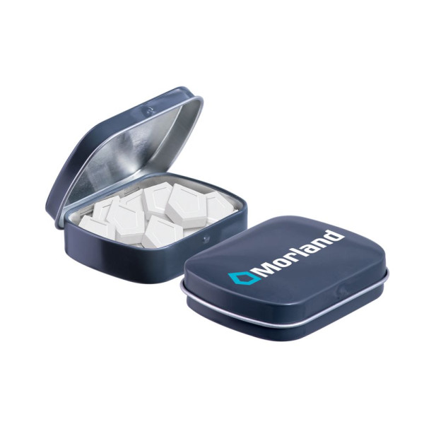 Mini Klappdeckeldose dunkelgrau mit ca. 23 Gramm Logo Pfefferminz, 4c-Euroskala bedruckt, mit Zutatenaufkleber und eingeschweißt