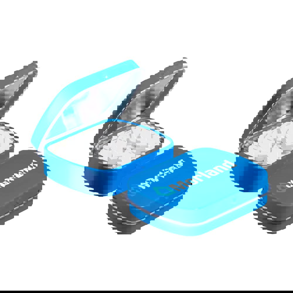Mini Klappdeckeldose kobaltblau mit ca. 23 Gramm Logo Pfefferminz, 4c-Euroskala bedruckt, mit Zutatenaufkleber und eingeschweißt