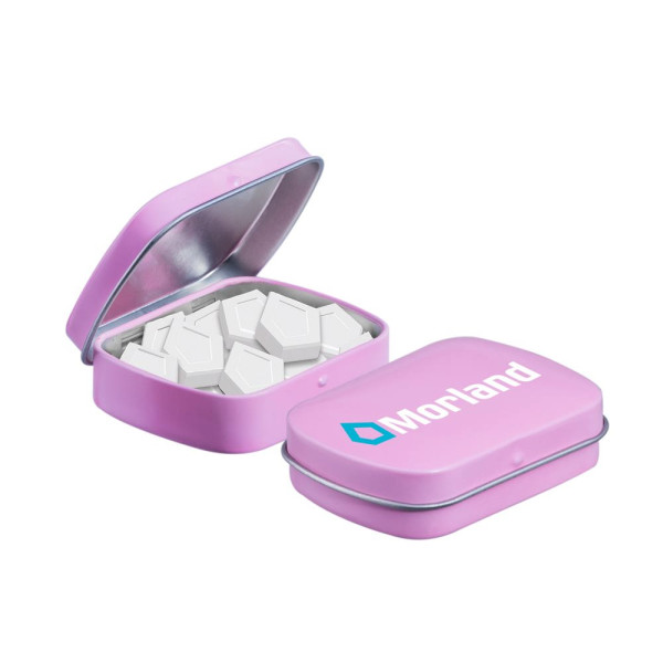 Mini Klappdeckeldose rosa mit ca. 23 Gramm Logo Pfefferminz, 4c-Euroskala bedruckt, mit Zutatenaufkleber und eingeschweißt