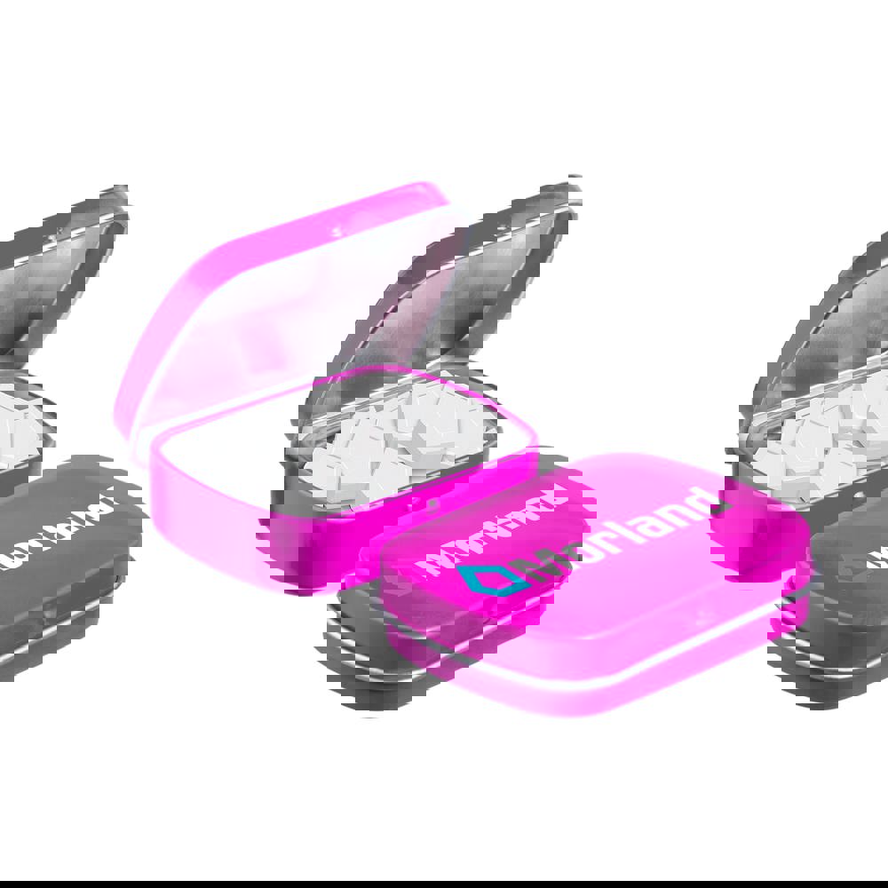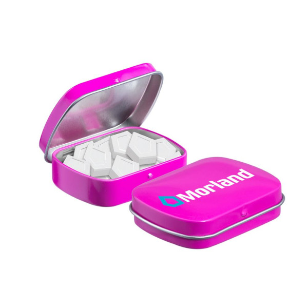 Mini Klappdeckeldose fuchsia mit ca. 23 Gramm Logo Pfefferminz, 4c-Euroskala bedruckt, mit Zutatenaufkleber und eingeschweißt