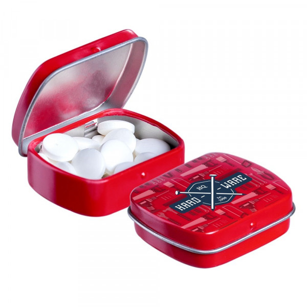 Mikro Klappdeckeldose rot mit ca. 9 Gramm Pfefferminz, 4c-Euroskala bedruckt, mit Zutatenaufkleber und eingeschweißt
