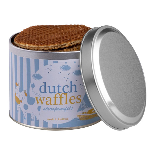 Dose gefüllt mit 8 Niederländische Butterstroopwaffel, in Folie eingewickelt und rundherum mit einem vollfarbig bedruckten Aufkleber versehen