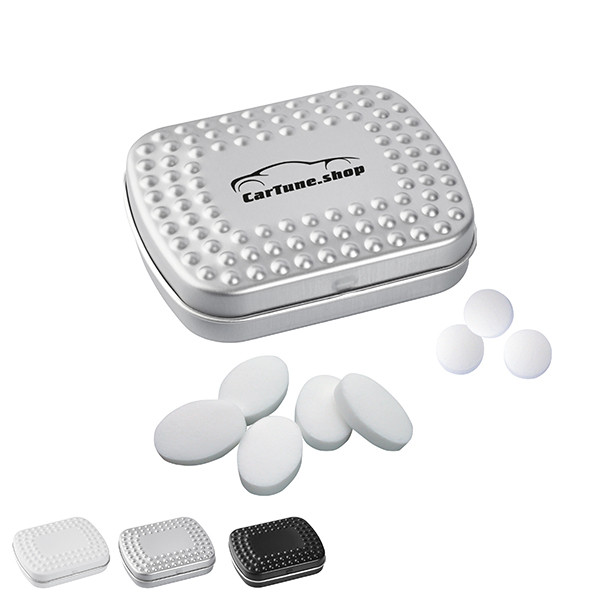 Metalldose weiß-, silber- oder schwarzmatt, rechteckig mit geprägtem Scharnierdeckel, wiederbefüllbar, mit Originalitätsverschluss. Solange Vorrat reicht.