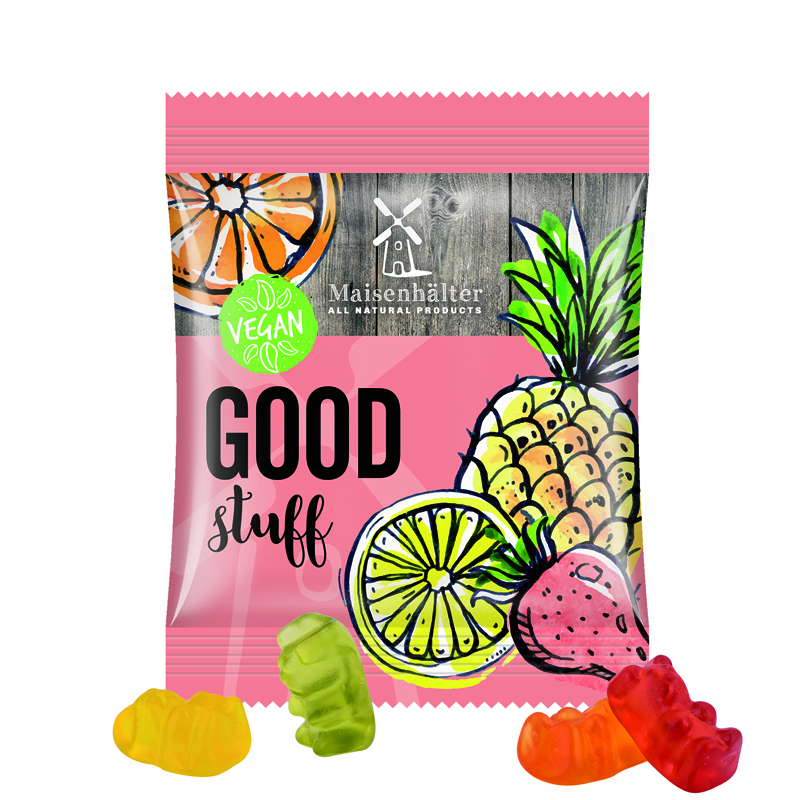 Trolli vegane Gummibärchen in Tüte aus weißer Folie, individuell bedruckt. Inhalt: Trolli vegane Gummibärchen mit 14 % Fruchtsaftanteil, bunt gemischt, 12 g
