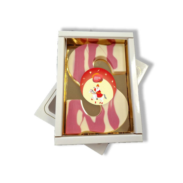 Rosa/weißer Creme-Buchstabe von ca. 150 Gramm in einer weißen Schachtel, versehen mit einem vollfarbigen Aufkleber auf der Vorderseite.