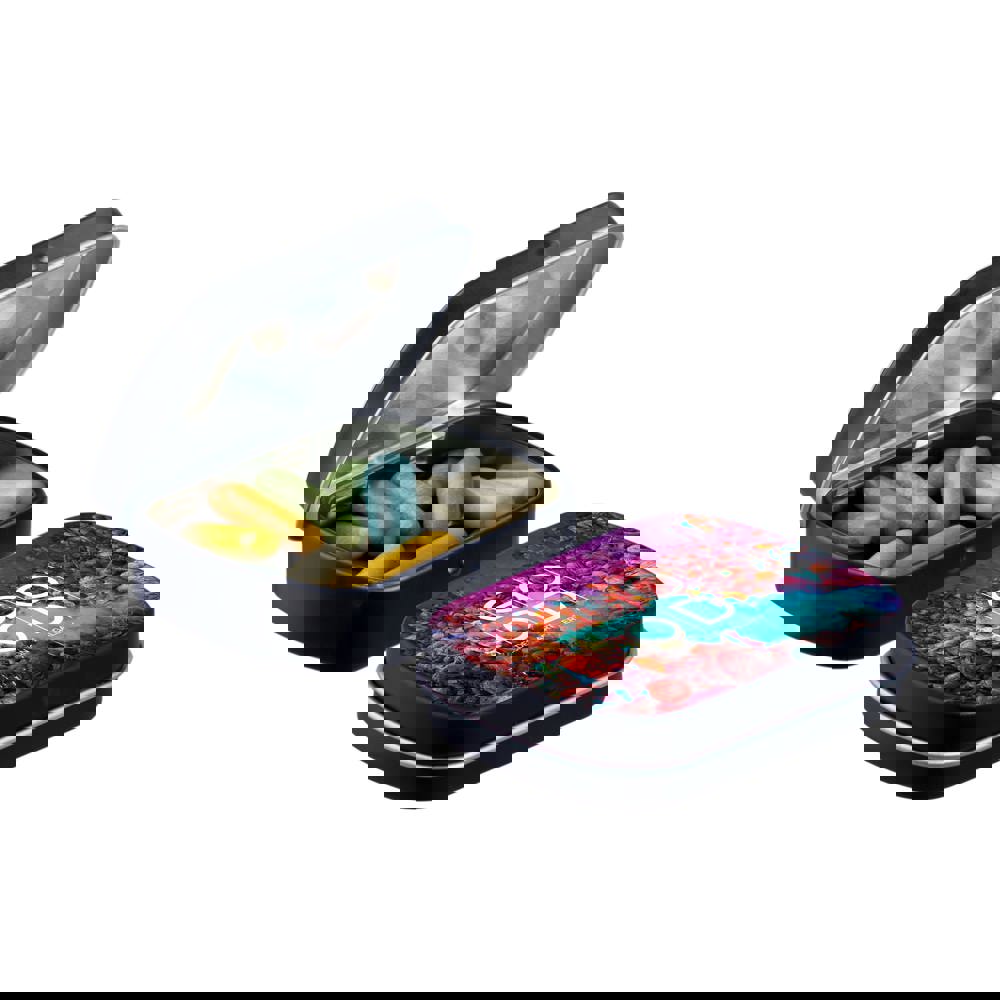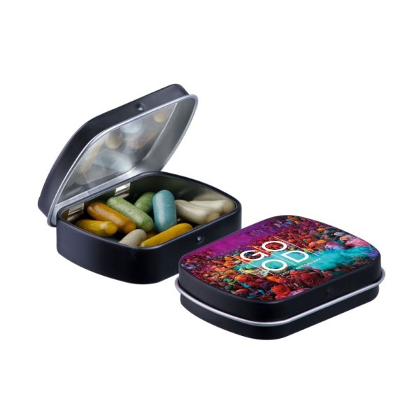 Mini matt schwarz Klappdeckeldose mit ca. 23 Gramm Lakritzstangen mix, vollfarbig bedruckt. Inklusive Inhaltsstoffaufkleber und eingeschweißt.
