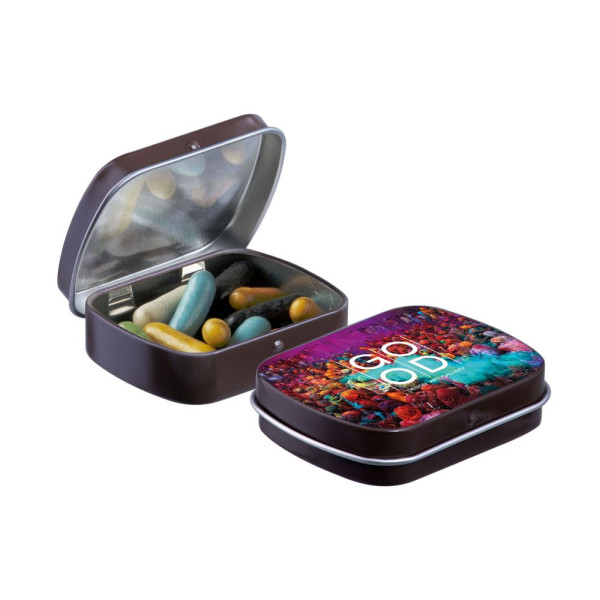 Mini braun Klappdeckeldose mit ca. 23 Gramm Lakritzstangen mix, vollfarbig bedruckt. Inklusive Inhaltsstoffaufkleber und eingeschweißt.