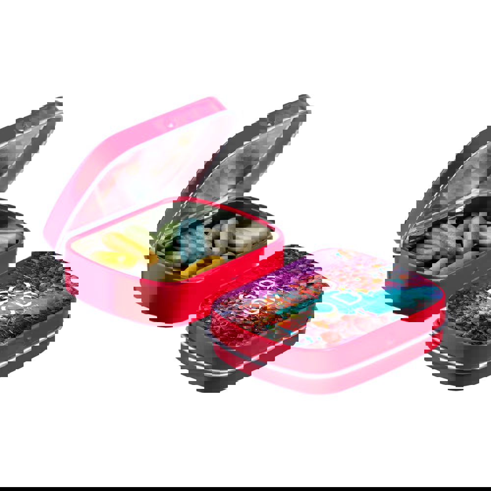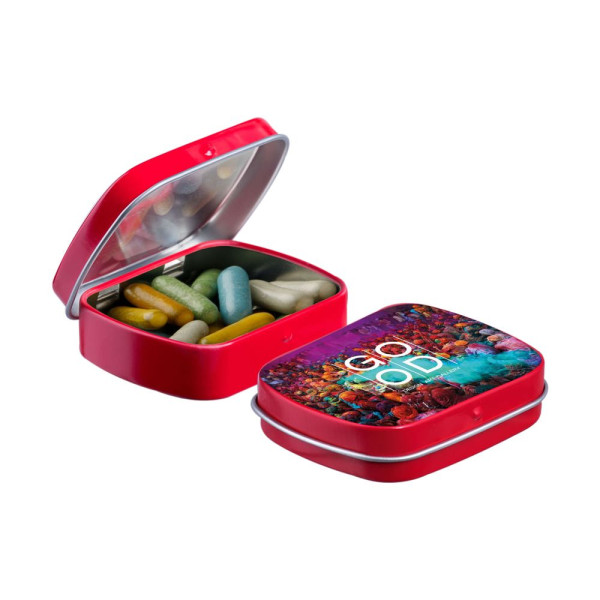 Mini rot Klappdeckeldose mit ca. 23 Gramm Lakritzstangen mix, vollfarbig bedruckt. Inklusive Inhaltsstoffaufkleber und eingeschweißt.