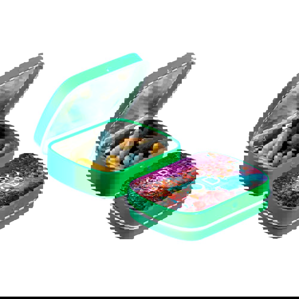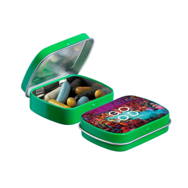 Mini grün Klappdeckeldose mit ca. 23 Gramm Lakritzstangen mix, vollfarbig bedruckt. Inklusive Inhaltsstoffaufkleber und eingeschweißt.