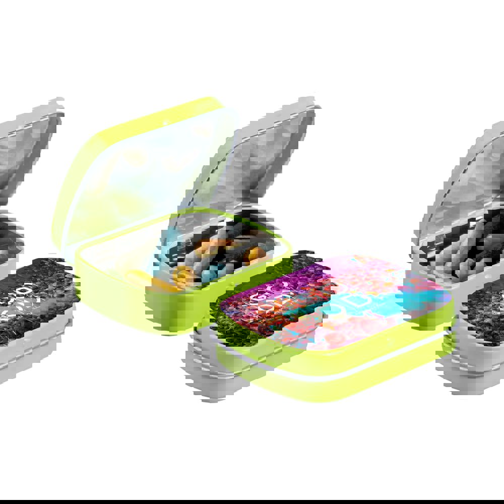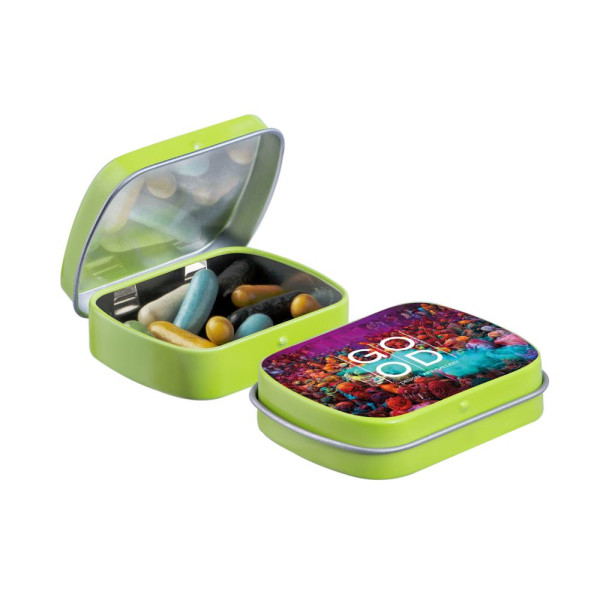 Mini limettengrün Klappdeckeldose mit ca. 23 Gramm Lakritzstangen mix, vollfarbig bedruckt. Inklusive Inhaltsstoffaufkleber und eingeschweißt.