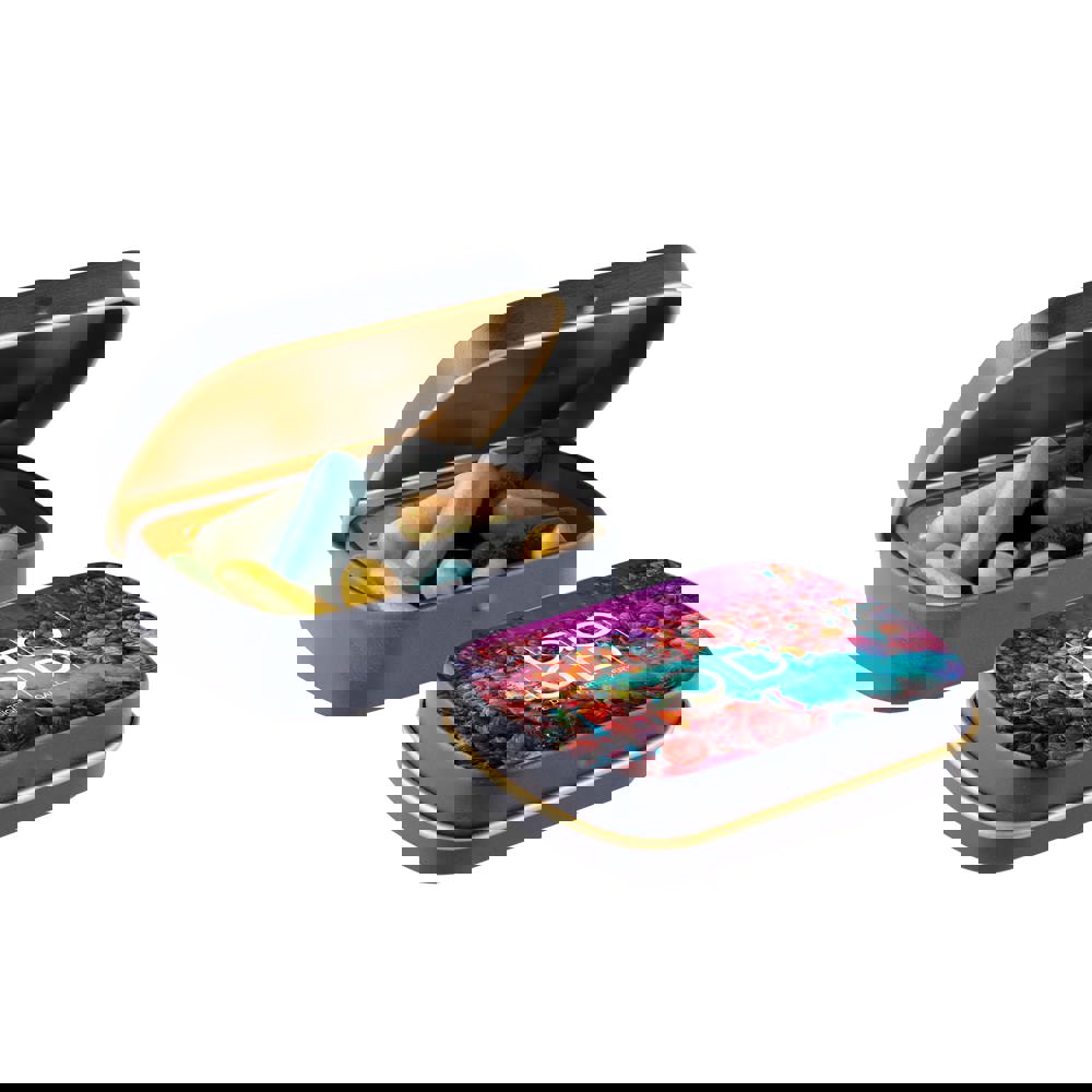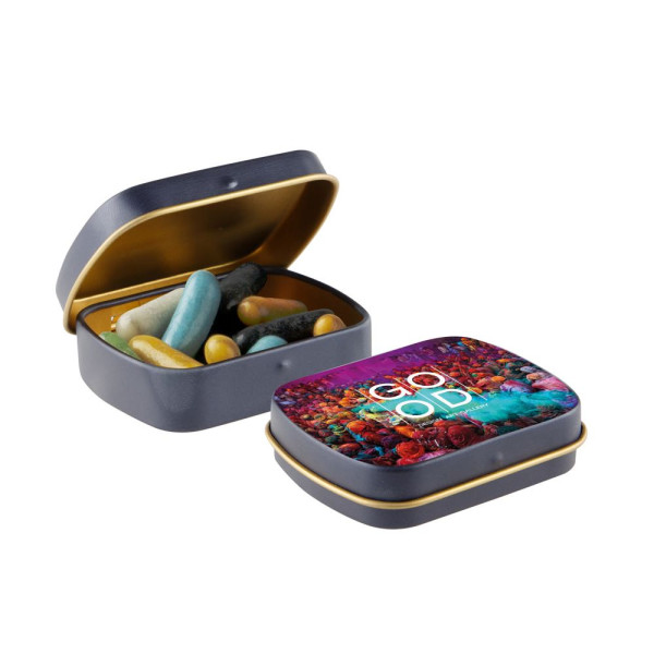 Mini Klappdeckeldose in matt dunkelblau mit goldener Innenseite und ca. 23 Gramm Lakritzstangen mix. Mit Vollfarbdruck, Inhaltsstoffaufkleber und Siegel.