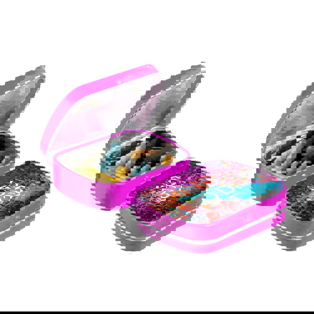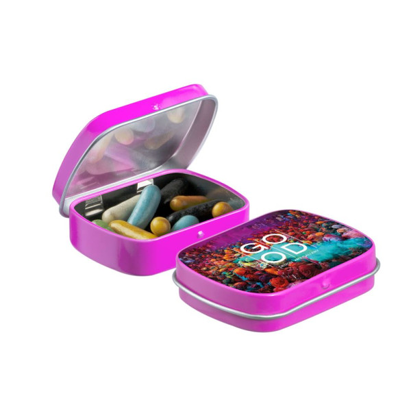 Mini fuchsia Klappdeckeldose mit ca. 23 Gramm Lakritzstangen mix, vollfarbig bedruckt. Inklusive Inhaltsstoffaufkleber und eingeschweißt.