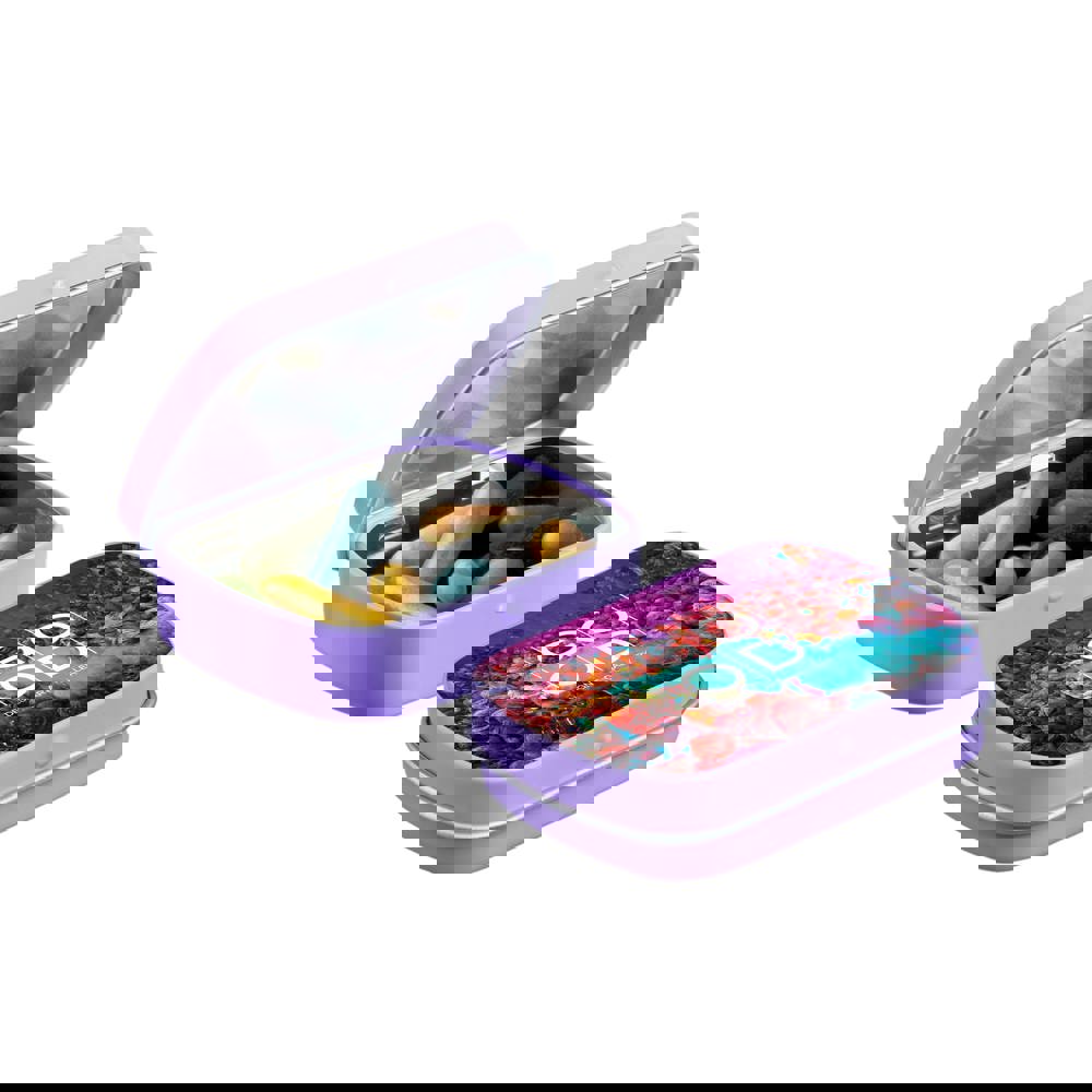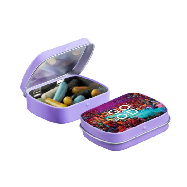 Mini lila Klappdeckeldose mit ca. 23 Gramm Lakritzstangen mix, vollfarbig bedruckt. Inklusive Inhaltsstoffaufkleber und eingeschweißt.