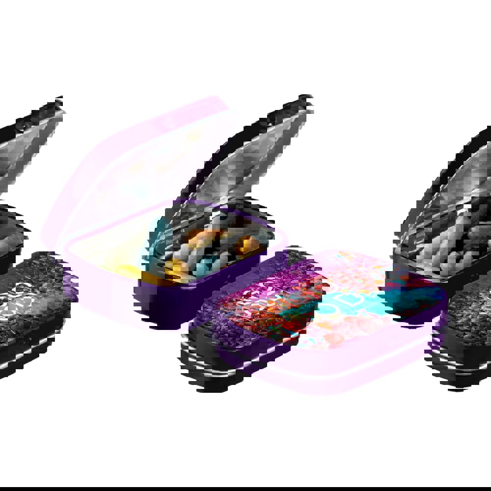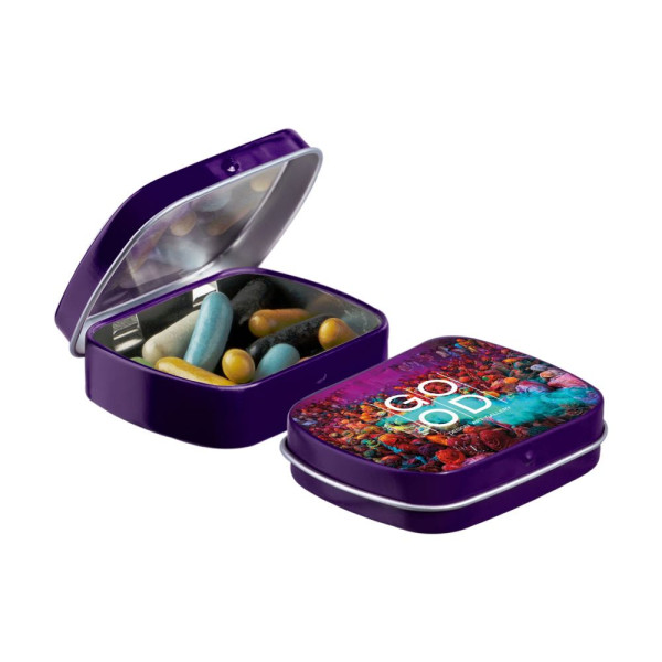 Mini violett Klappdeckeldose mit ca. 23 Gramm Lakritzstangen mix, vollfarbig bedruckt. Inklusive Inhaltsstoffaufkleber und eingeschweißt.