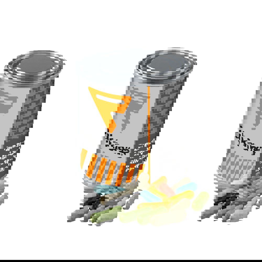 Kleine Farbdose mit farbigem Umschlag, gefüllt mit ca. 110 Gramm Lakritzstangen Mix