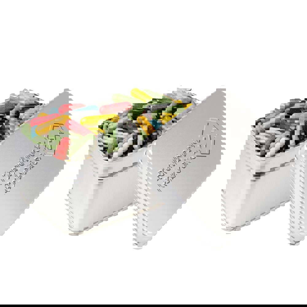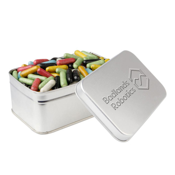 Rechteckige Dose mit Prägung auf dem Deckel, gefüllt mit ca. 140 Gramm Metallic Sweets mehr