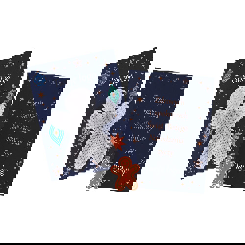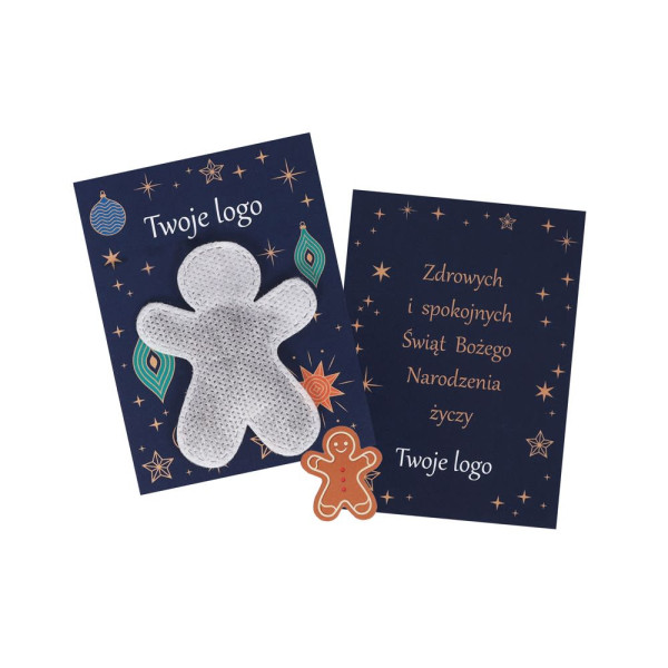Teebeutel mit Zimttee in Form eines Lebkuchenmännchens auf einer vollfarbig bedruckten Karte