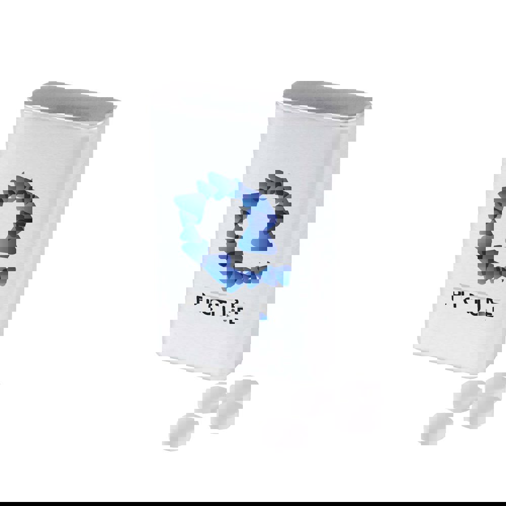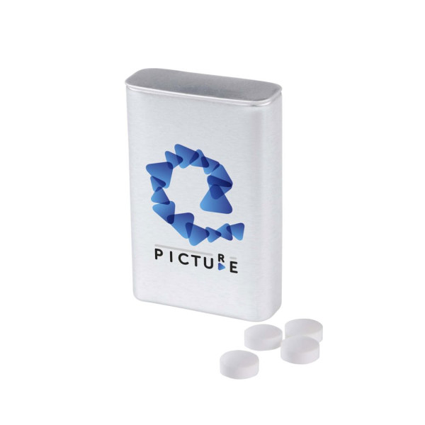 Silbernes Pocket-Döschen mit ca. 18 Gramm Pfefferminz, versehen mit vollfarbigem Druck. Inklusive Zutatenetikett und Versiegelung.
