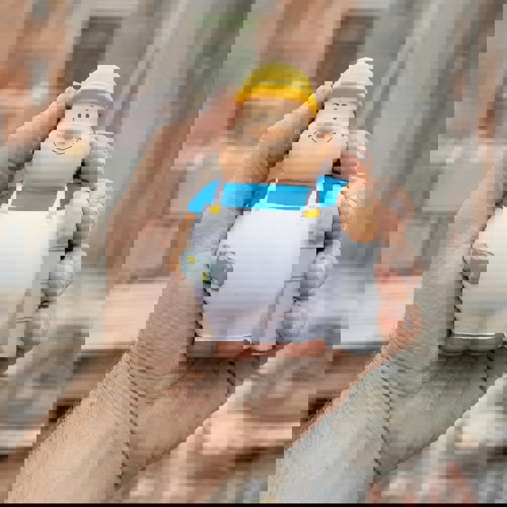 Stein auf Stein, das Häuschen wird bald fertig sein. Der Maurer Bert® ist ein fleißiger Kollege des Zimmermann Bert®. Hand in Hand arbeiten sie für eine entspannte Atmosphäre auf der Baustelle. Auch wenn unter Hochdruck an der Fertigstellung des Objektes gearbeitet wird, behalten sie die Nerven und Lächeln Hektik einfach weg. SQUEEZIES® Maurer Bert® zum Abbau von Stress einfach "zusammenknautschen". Durch die Materialbeschaffenheit nimmt das Produkt die Ursprungsform wieder ein.