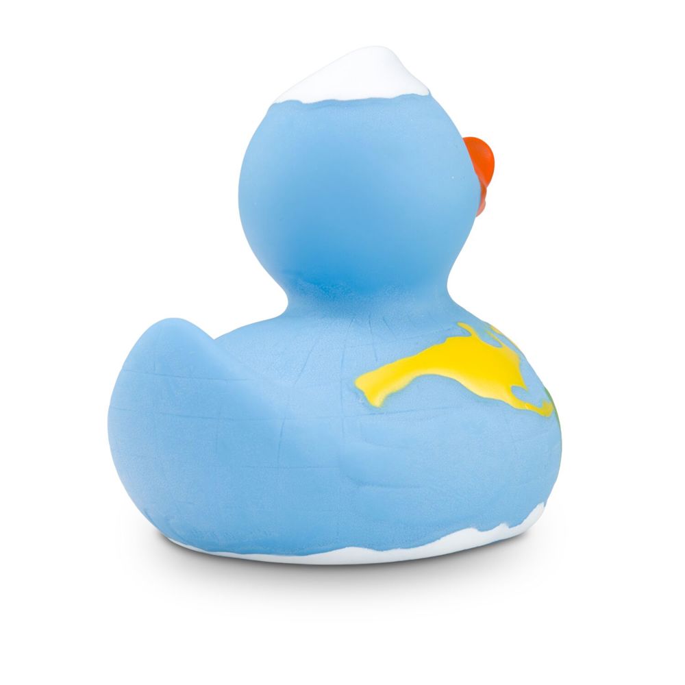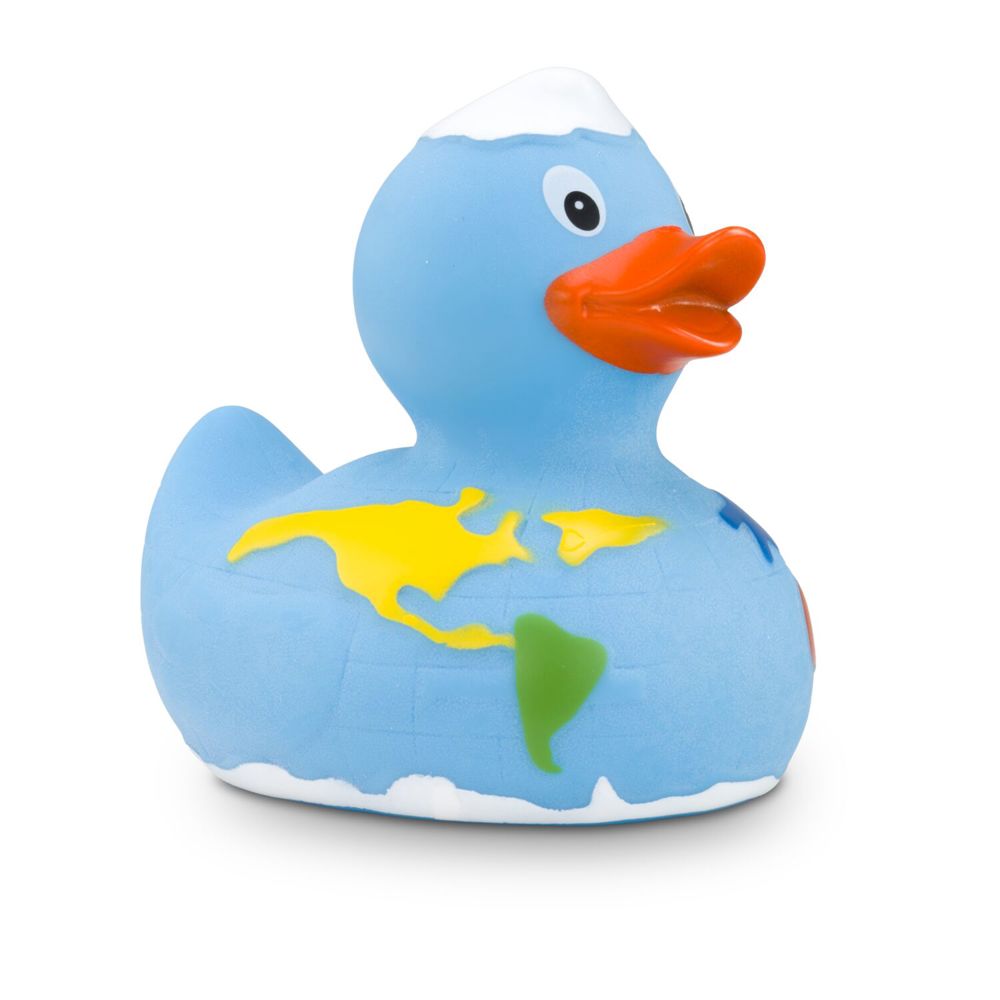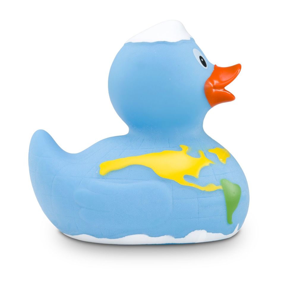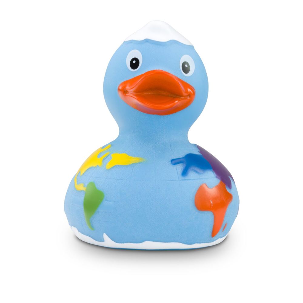 Erna Erdkugel hat schon die ganze Welt bereist. Diese hellblaue Quietscheente zeigt wie ein Globus rundherum bunte Kontinente und trägt den weißen Nordpol stolz auf dem Kopf. Ideal als Geschenk für Reiselustige, Abenteurer, Geografie-Fans oder als kreativer Werbeartikel für Reisebüros und Bildungseinrichtungen. Mit Erna Erdkugel wird jedes Schaumbad zur spannenden Weltreise. Größe: ca. 8 cm. Inklusive Quietschventil