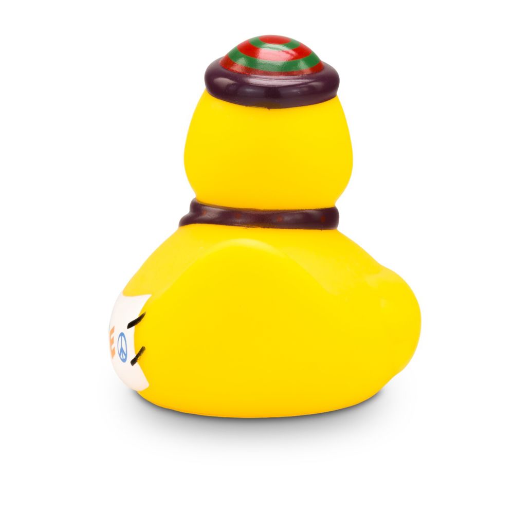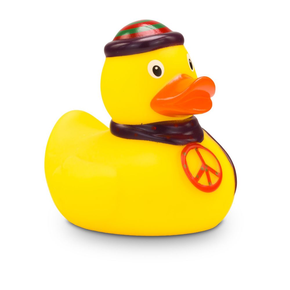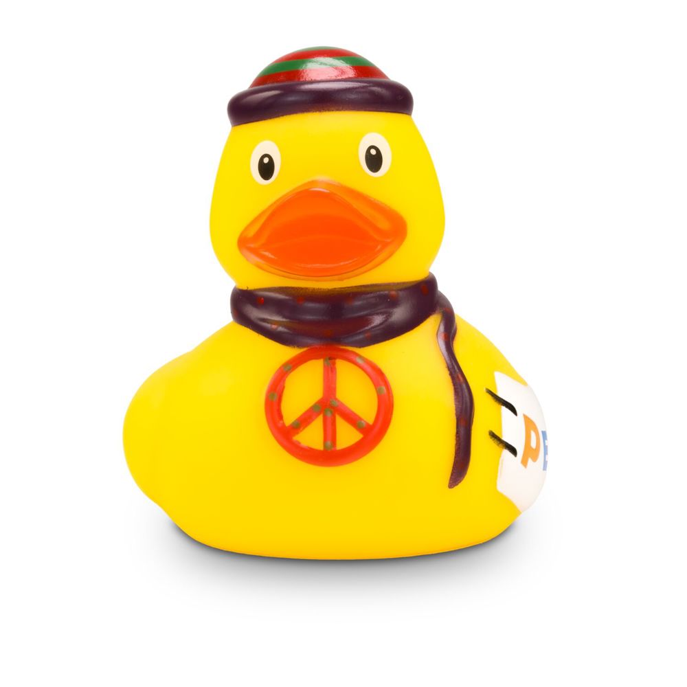 Fridolin Frieden ist ein echter Friedensbotschafter. Er trägt ein Peace-Symbol an einem braunen Band um seinen Hals und eine braune Mütze mit rot-grünen Details im Hippie-Style. Er hält ein weißes Banner mit bunten Buchstaben unter dem Flügel. Darauf steht: PEACE. Seine Botschaft? Make love, not war! Ein echter Botschafter für Toleranz, Individualität und Vielfalt. Größe: ca. 8 cm. Inklusive Quietschventil