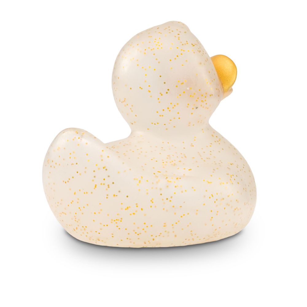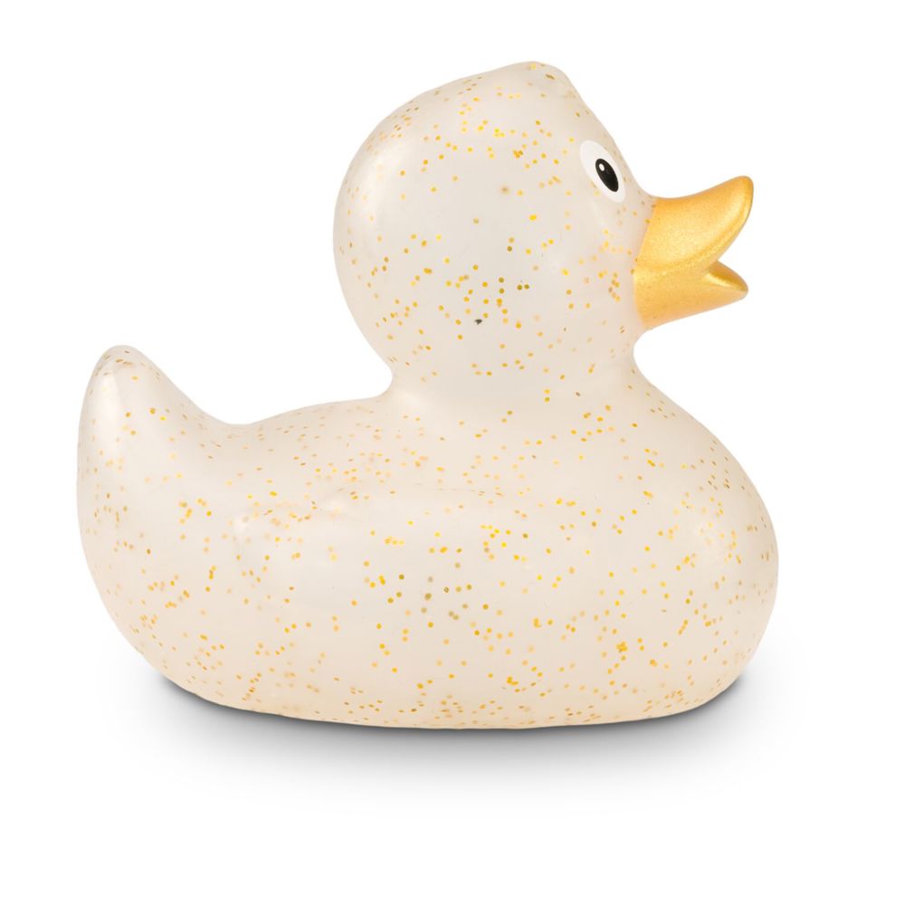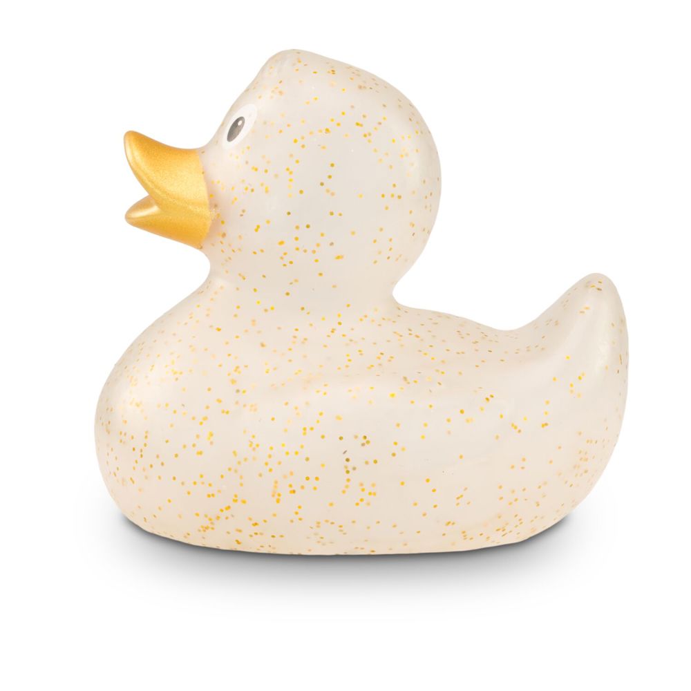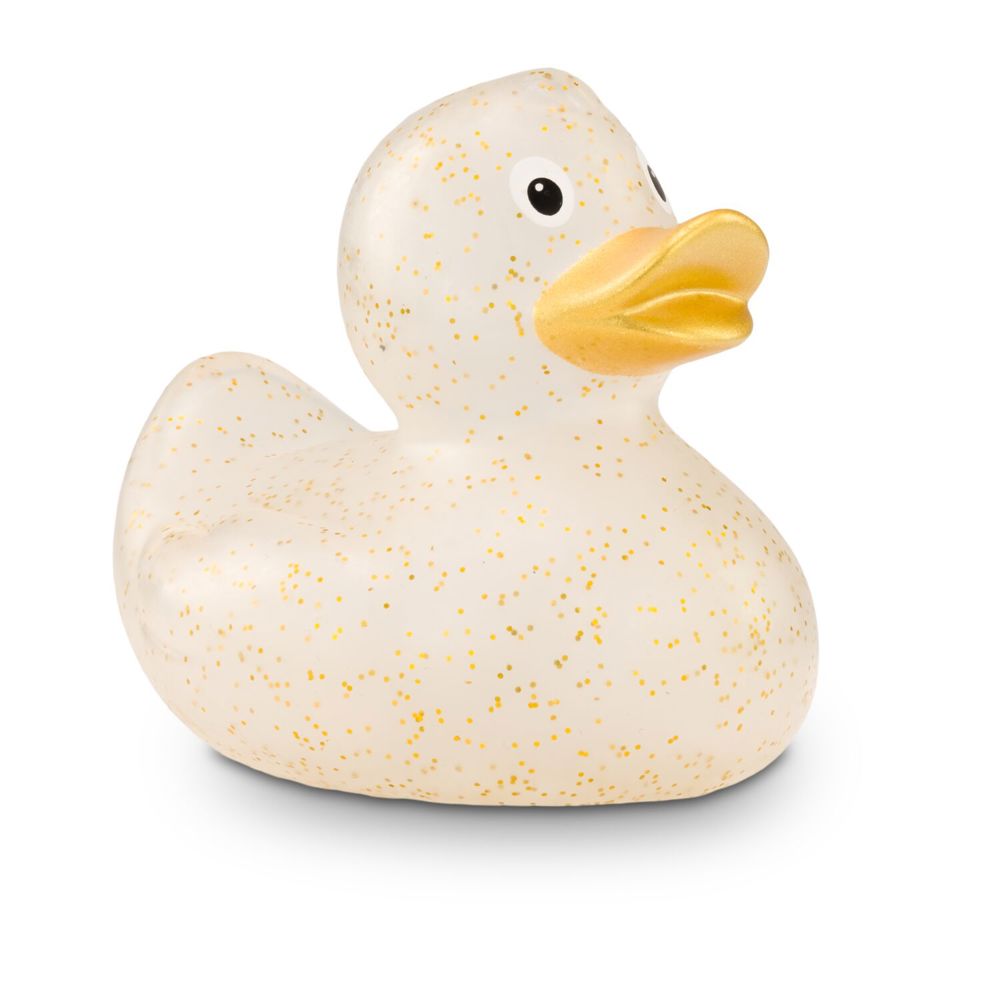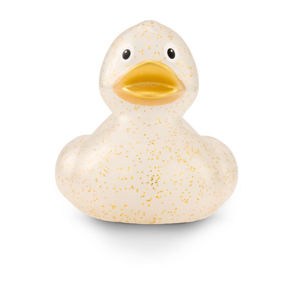 Giselle Goldglitzer funkelt mit Gloria Goldglitzer und den Sternen um die Wette. Goldene Partikel glitzern auf ihrem transparenten Körper. Durch das spezielle Herstellungsverfahren sieht jede Giselle Goldglitzer anders aus und ist damit ein echtes Unikat. Der vollfarbig goldene Schnabel rundet das glänzende Erscheinungsbild ab. So besonders ihr Erscheinungsbild, so klassisch ihre Körperform. Ihr formschönes und zeitloses Design gehört zu den Badeenten-Klassikern. Damit hat sie noch viele große und kleine Geschwister, auch in anderen Farben. Größe: ca. 8 cm. Inklusive Quietschventil