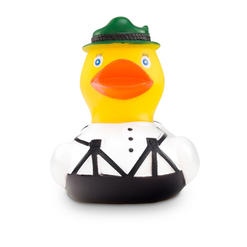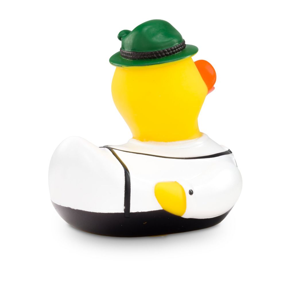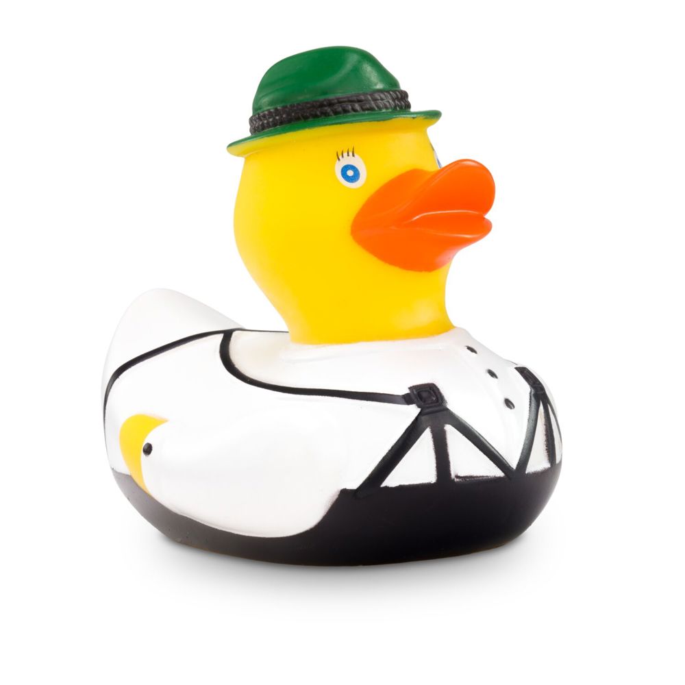 Ludwig Lederhose trägt sein bayerisches Kleidungsstück mit Stolz. Die traditionelle braune Lederhose mit Hosenträgern kombiniert mit einem weißen, alpenländischen Trachtenhemd lässt ihn richtig fesch aussehen. Auf dem Kopf hat er einen grünen Filzhut. Die perfekte Ente für bayerische, tiroler oder südtiroler Volksfeste! Größe: ca. 8 cm. Inklusive Quietschventil