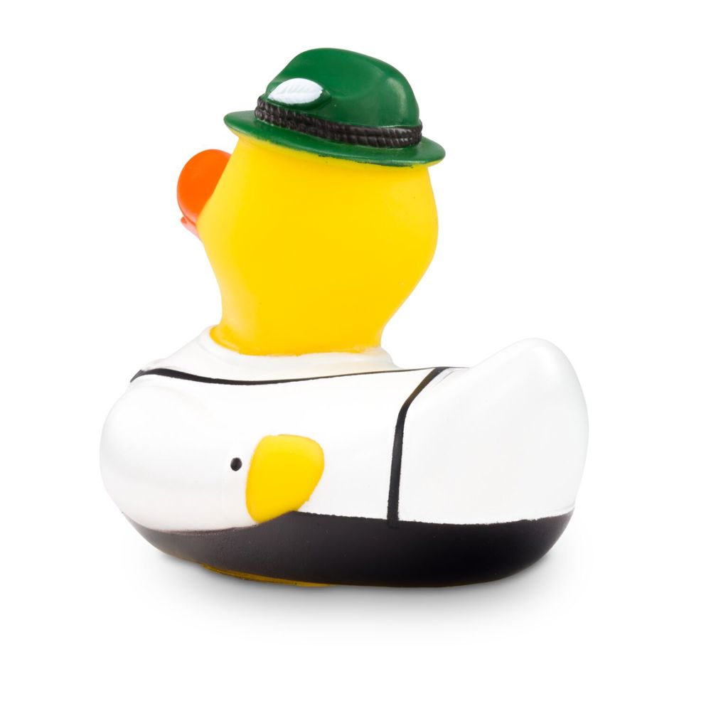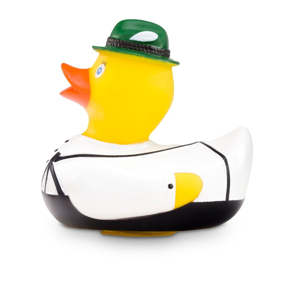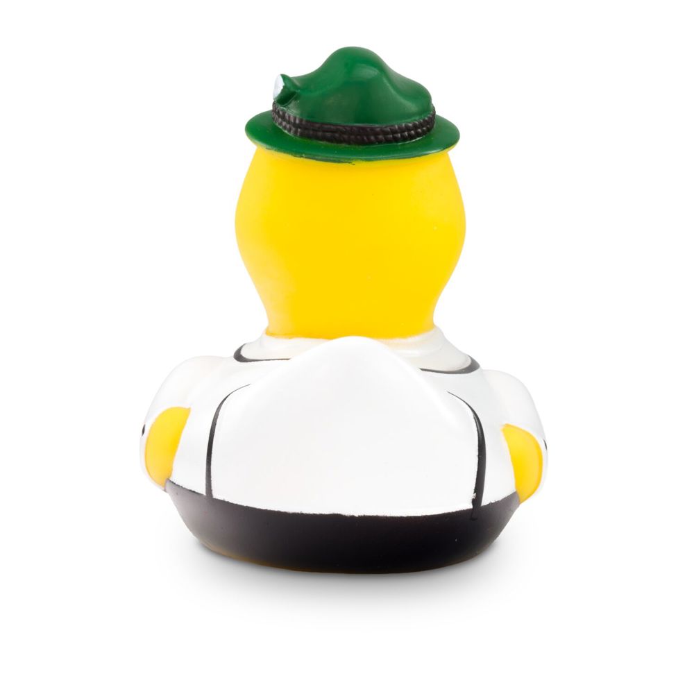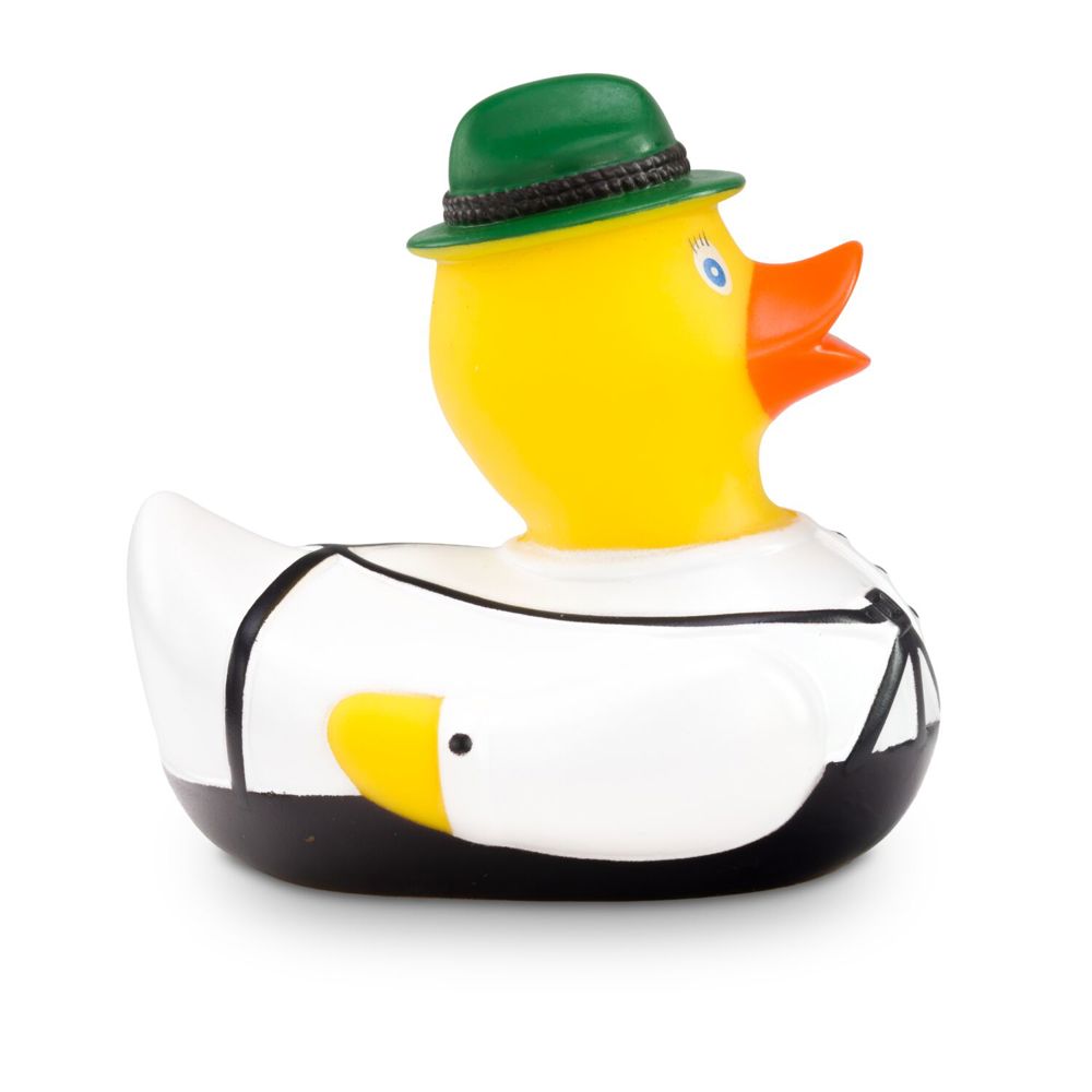 Ludwig Lederhose trägt sein bayerisches Kleidungsstück mit Stolz. Die traditionelle braune Lederhose mit Hosenträgern kombiniert mit einem weißen, alpenländischen Trachtenhemd lässt ihn richtig fesch aussehen. Auf dem Kopf hat er einen grünen Filzhut. Die perfekte Ente für bayerische, tiroler oder südtiroler Volksfeste! Größe: ca. 8 cm. Inklusive Quietschventil