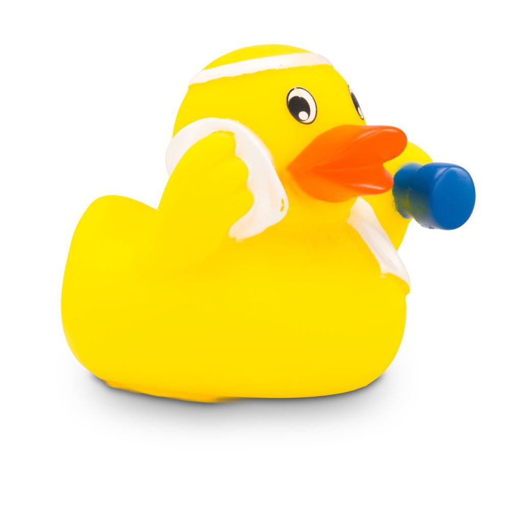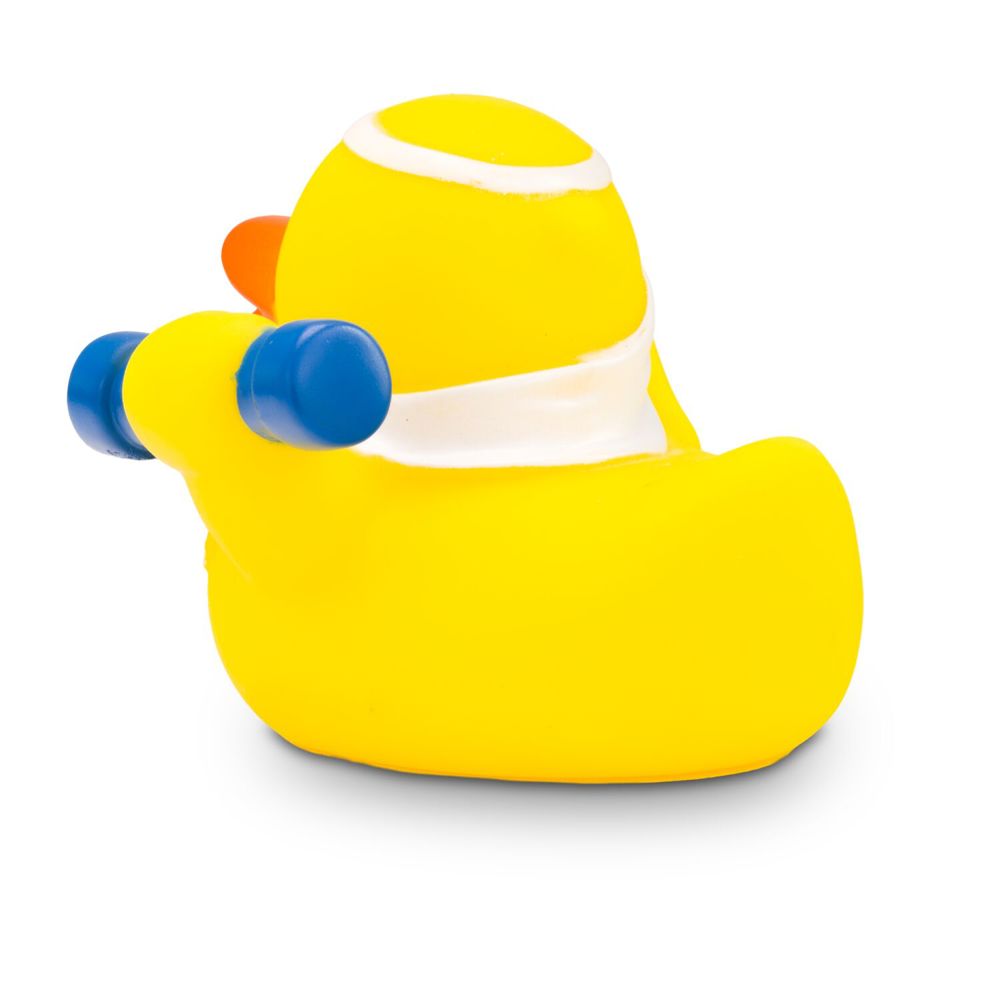 Der toughe Muskelprotz Herbert Hantel ist jeden Tag im Fitnessstudio und trainiert fleißig. Die blaue Hantel in der Hand braucht er für sein Workout. Wenn er ins Schwitzen kommt, helfen ihm Handtuch und Stirnband. Sein Motto? No pain, no gain! Größe: ca. 8 cm. Inklusive Quietschventil