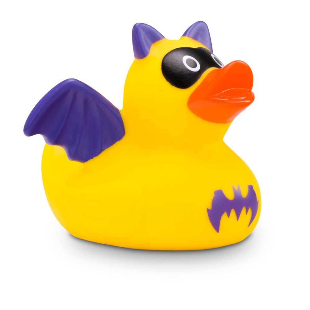 Batduck, die Superhelden-Quietscheente für alle Comic-Fans im gelb-lila Fledermauslook: Mit schwarzer Augenmaske, lila Flügeln, spitzen Ohren und lila Fledermaus-Logo auf der Brust ist diese Badeente bereit für große Heldentaten in der Badewanne. Größe: ca. 8 cm. Inklusive Quietschventil