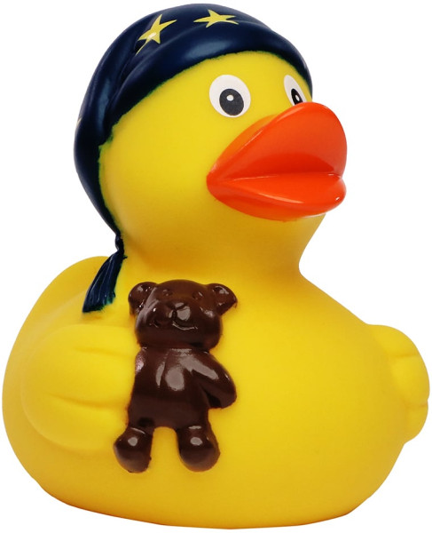 Schlaaaaf, Entlein, Schlaaaaf. Nach einem entspannend Bad ist das kleine Entlein bereit für eine erholsame Nacht. Die Schlafmütze wärmt das Köpfchen und mit dem Teddy wird herzlich gekuschelt.