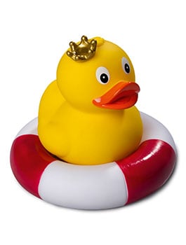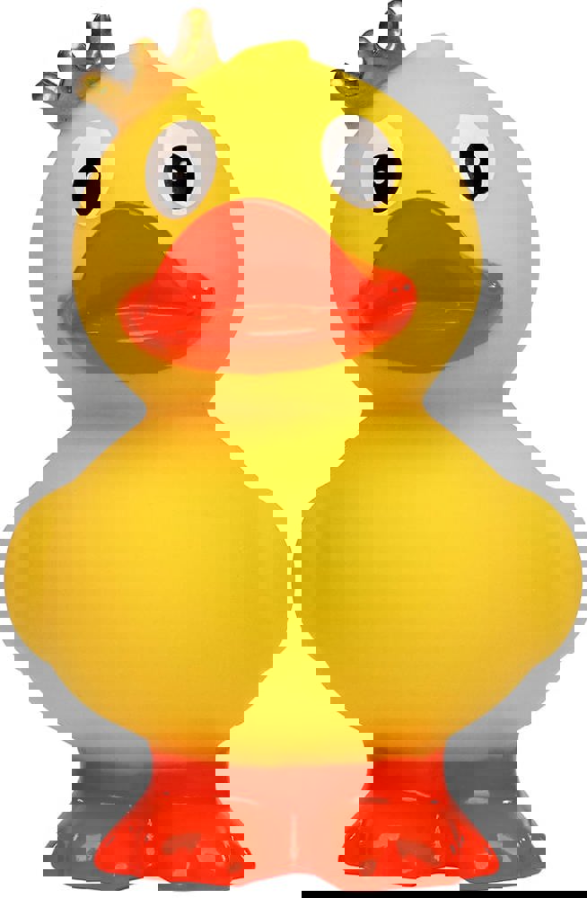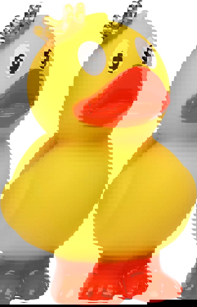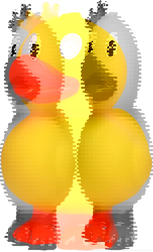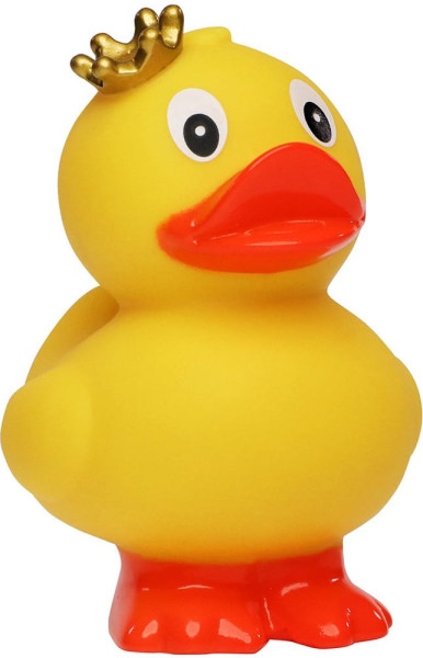 Das stehende Entlein mit dezentem goldenen Krönlein ist ein besonders niedliches Exemplar der Gattung der Badeenten. Im klassischen gelben Gefieder und mit großen Kulleraugen gewinnt es jeden für sich. Auf den orangen Füßchen geht es im Watschelgang in Ihr Herz und Badezimmer. Mit dem separat erhältlichen Schwimmring ist die Quietsche-Ente "König, stehend" bereit für eine Schwimmrunde.