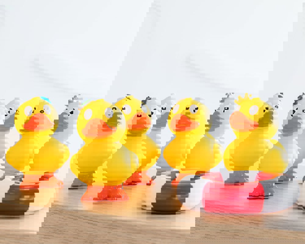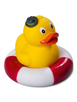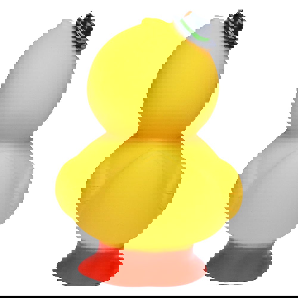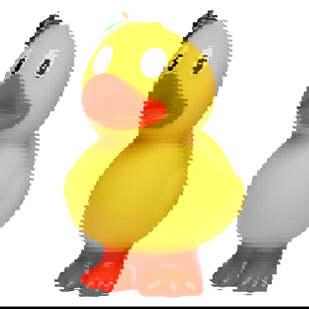 Das stehende Entlein mit dezentem Trachtenhut ist ein besonders niedliches Exemplar der Gattung der Badeenten. Im klassischen gelben Gefieder und mit großen Kulleraugen gewinnt es jeden für sich. Auf den orangen Füßchen geht es im Watschelgang in Ihr Herz und Badezimmer. Mit dem separat erhältlichen Schwimmring ist die Quietsche-Ente "Bayern, stehend" bereit für eine Schwimmrunde.